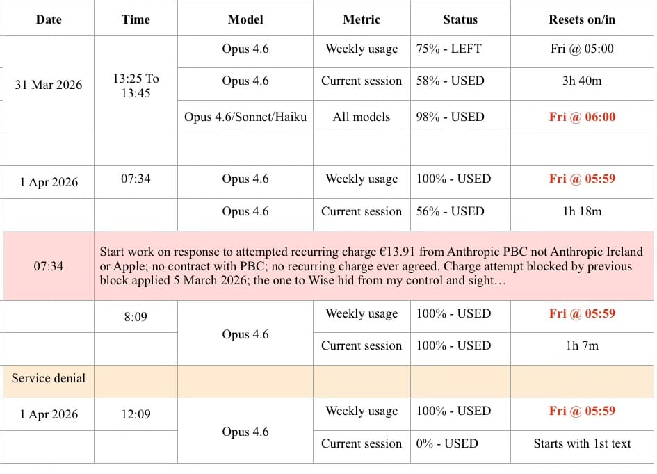 The first column ‘date’ for 1 April 2026 shows that between 07:34 and 08:09, I started work on the Anthropic PBC development, especially the bank’s odd policy choices and the stand they’re taking…