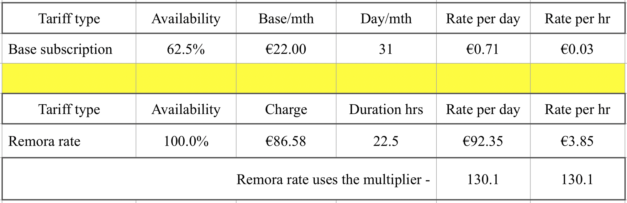 Note: the operand, 130.1, above, is a function of dividing the remora rate per day, or hr by the Base subscription rate per day, or hour, respectively.