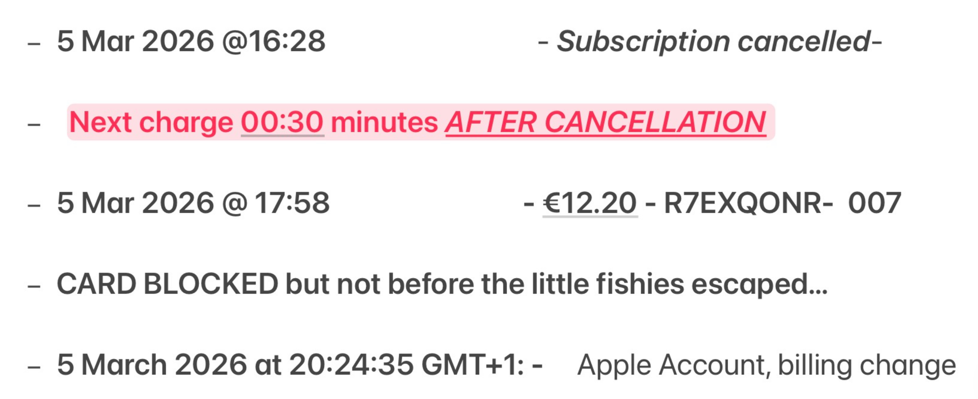 Apple’s records claim that I cancelled 4 hours after I actually cancelled, I assume to provide cover for the illegal charge made by Anthropic.