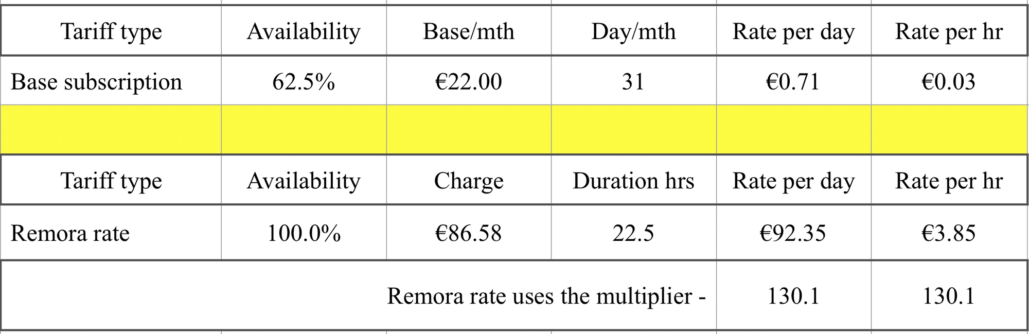 Remora rate per hour €3.85 / €0.03 base subscription rate= 130.1.